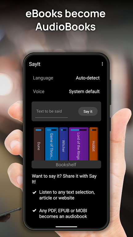 SayIt transforms the way you read and listen—instantly turning websites, text selections, PDFs, EPUBs, and MOBI files into smooth, natural audio. Whether you want a hands-free reading companion, a bilingual learning tool, or the best text to speech app for commuting, SayIt makes it effortless. It’s perfect for converting articles to audio, creating offline read-aloud PDFs, and enjoying true multitasking.