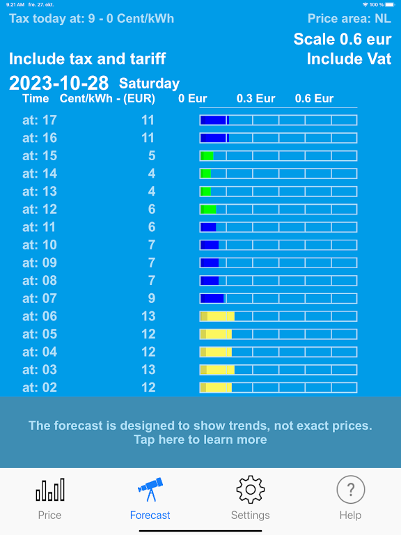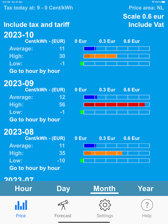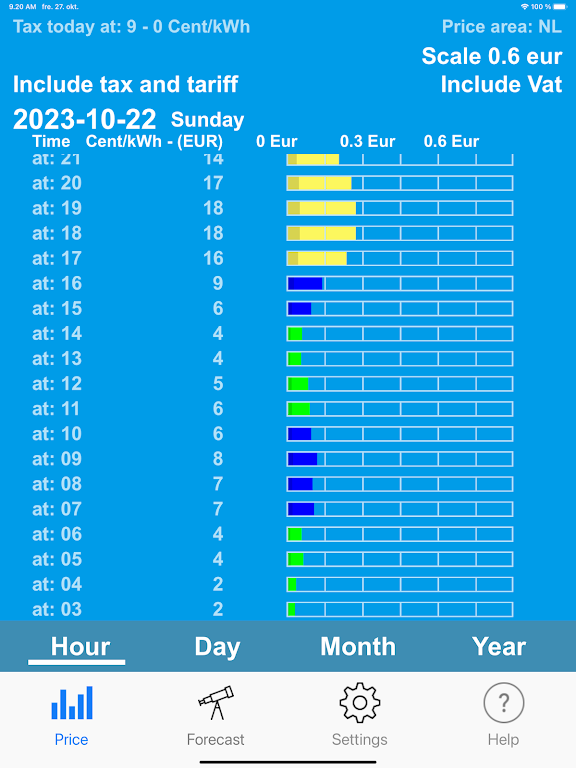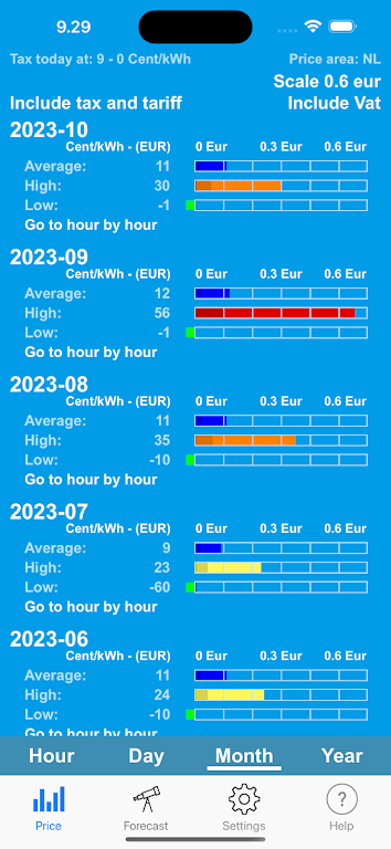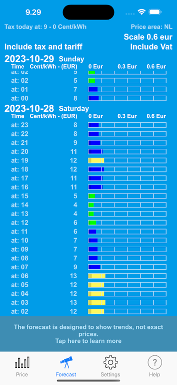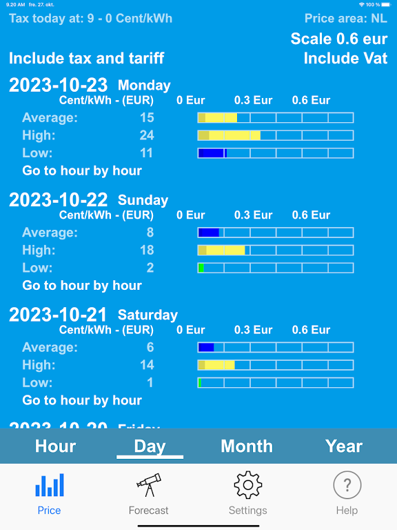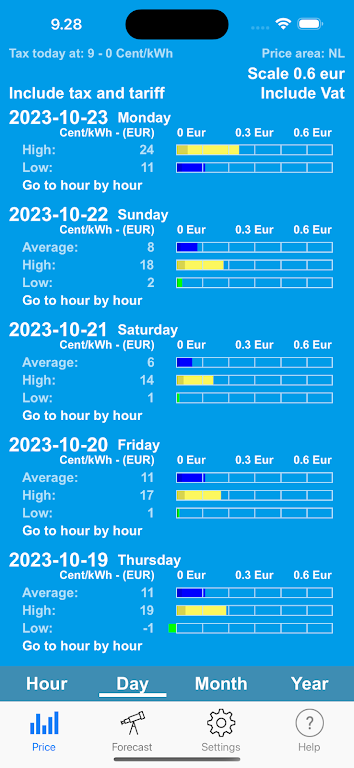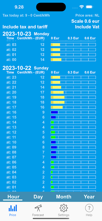 Stay on top of electricity spot prices with clear 24-hour views, historical charts, and multi-day forecasts that update automatically each afternoon. See future rates as soon as they’re released and compare costs with or without taxes, tariffs, and VAT for better home energy planning.