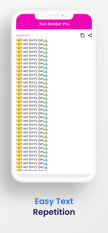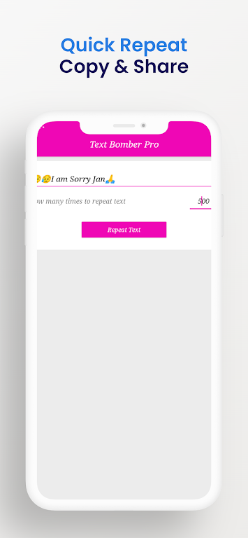 Text Bomber Pro is a simple, time-saving tool that lets you duplicate any word, phrase, or sentence up to 9999 times with a single tap. Whether you're emphasizing a point, creating catchy slogans, or generating fun repeat messages for friends, this fast message generator app makes it effortless. It’s perfect for users who enjoy creative texting, auto typing repeater tools, and bulk text creator features.