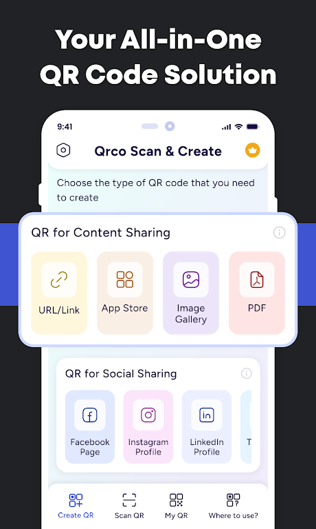 ✔️ Multi-function: Scan and create various QR types without switching apps