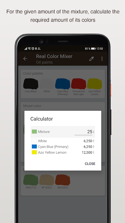 Unlike traditional RGB color models, Real Color Mixer utilizes the spectrum of light and the way colors absorb and reflect light. This unique approach ensures you get realistic results, so mixing red, green, and blue will never turn into black or white — instead, you can create rich, natural colors like dark khaki or vibrant hues. Take control of your color mixing with features like customizable palettes, a color accuracy search, and easy-to-use tools for importing and exporting palettes. With over 430 predefined colors and an accurate color picker, your creative possibilities are endless.