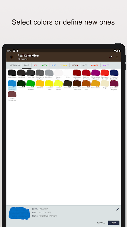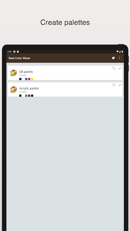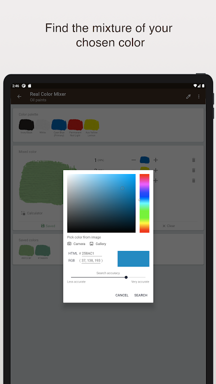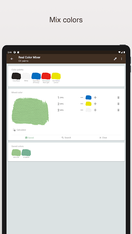 Real Color Mixer is a powerful tool for artists, designers, and DIY enthusiasts, simulating the process of mixing real paints (such as oil or acrylic) without the mess. Experiment with different proportions of colors and preview the results instantly, all while learning the fascinating science behind color blending. Whether you're creating new shades for a painting or designing a color palette, this app offers an intuitive way to explore color mixing in a virtual space.