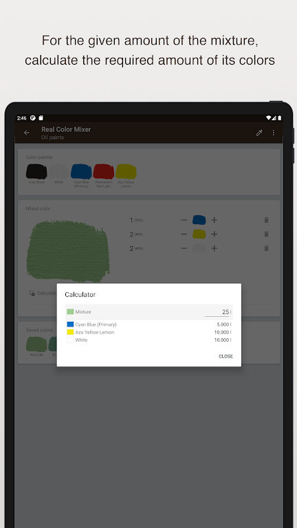 Mixing colors is as simple as dragging and dropping your selected hues into the "mixer color" panel. Use the plus (+) and minus (-) buttons to adjust the proportions of each color — with long presses to change the mix by 10 units at once. Plus, the built-in calculator helps you determine the exact amount of each component paint needed to achieve your desired mixture in various volume units (Liters, Fluid ounces, Gallons, Pints, or Quarts).