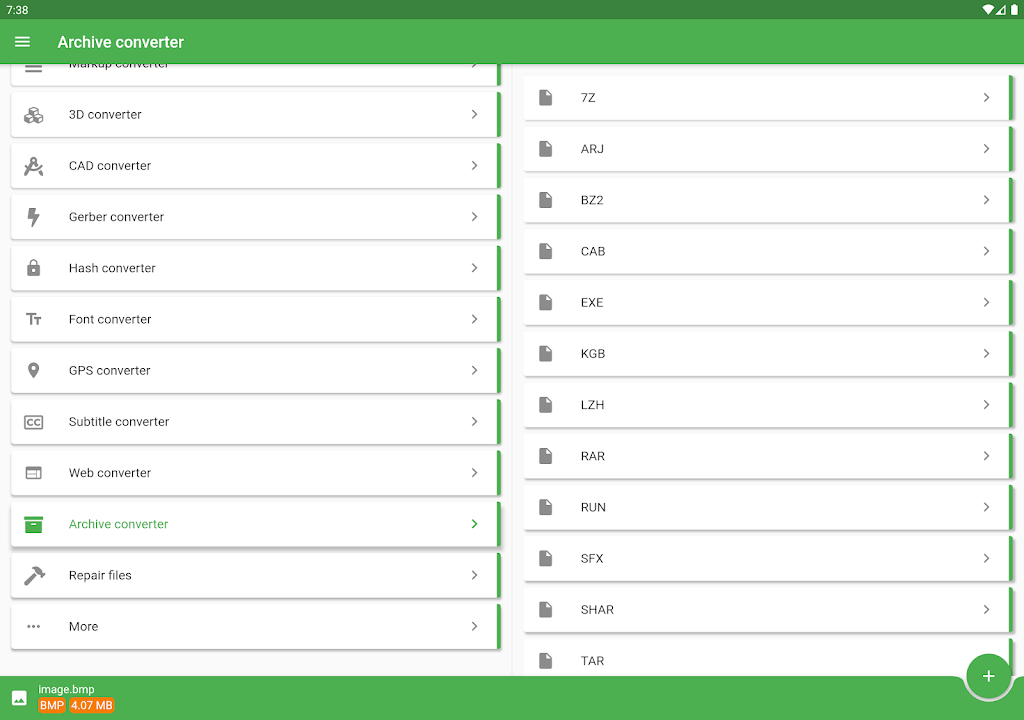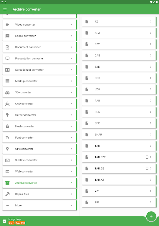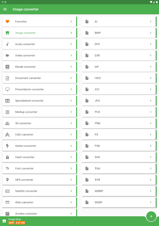 • Ebooks: AZW, ePub, DOCX, FB2, LRF, MOBI, PDB, TCR, HTML, TXT, PDF, LIT, plus DJVU, OEB, PML, RB, RTF, SNB • Video: MP4, WebM VP8, WMV, MKV, AVI, FLV, OGV, MOV, 3DS, 3GP • Images: PNG, JPG, BMP, GIF, WebP, EXR, SVG, EPS, TIFF, ICO, TGA, WBMP • Audio: MP3, WAV, FLAC, OGG, AAC, WMA, OPUS, AIFF, MMF, M4A • Documents: DOC, DOCX, ODT, PPT, PPTX, SWF, HTML, PDF, RTF, TXT • Presentations: ODP, PDF, PPSX, PPT, PPTX, SWF, UOP • Markup: TEX, MD, TEXT, Textile, AsciiDoc, Docx, ePub, HTML, INFO, PDF, TEXI, WIKI, PPTX, RTF • 3D models: STL, DAE, FBX, IGS, STP, WRL/X3D, STPZ, 3DS, BRP, CTM, OBJ • Compressed files: 7Z, TAR BZ2, TAR GZ, EXE, RUN, ZIP • Spreadsheets: CSV, ODS, OTS, PDF, UOS, XLS, XLSX • CAD: DWG, DXF, SVG, PDF • GPS tracks: CSV, GDB, GPX, HTML, KML, KMZ, LOC, NMEA, SDF, TCX, TRK, TXT, USR, WPT, XLS/XLSX • Hashes: Htpasswd, DES, MD5, RIPE, SHA, Adler • LaTeX / ConTeXt: PDF, TEX, DOCX • Fonts: BIN, CFF, DFONT, EOT, FON, OTF, PFA, PFB, PS, PT3, SVG, T11, T42, TTF, TTF.BIN, WOFF, WOFF2 • Gerber PCB: CNC, GBR, ISEL, PDF • Subtitles: LRC, SCC, SRT, SUB, USF • Metadata: extract or remove EXIF and more