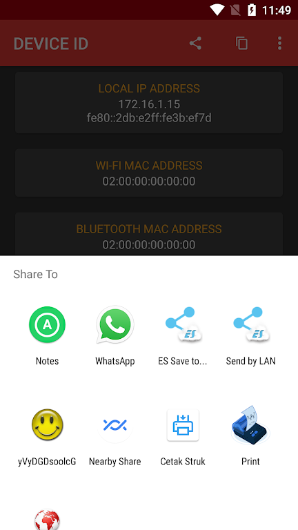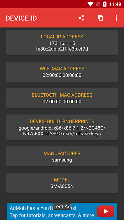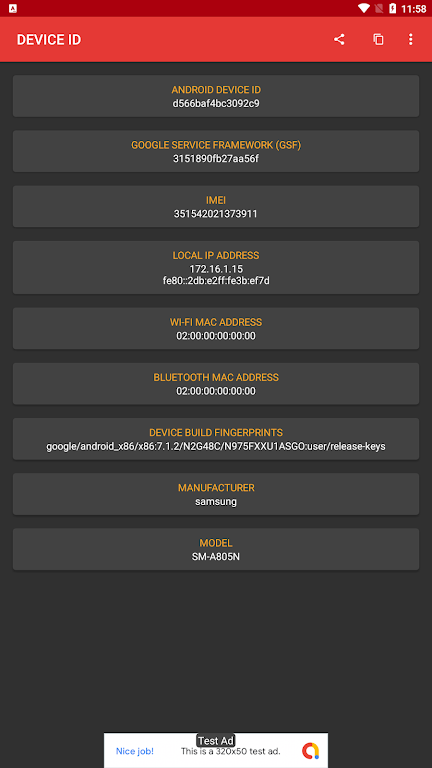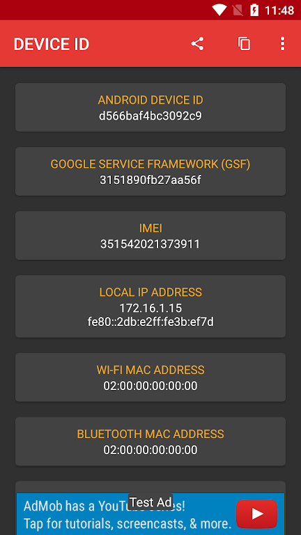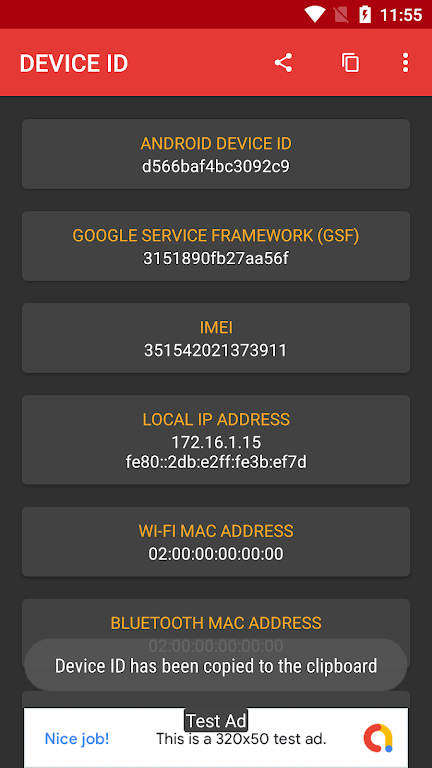 Discover comprehensive device information with this essential utility. Easily access unique details such as your device ID, Google Service Framework (GSF), IMEI, Local IP Address, Wi-Fi Mac Address, Bluetooth Mac Address, Device Build Fingerprints, Manufacturer, and Model. Whether you're a developer, tech enthusiast, or just want to understand your device better, this app gives you all the tools you need to gain deeper insights into your Android device.