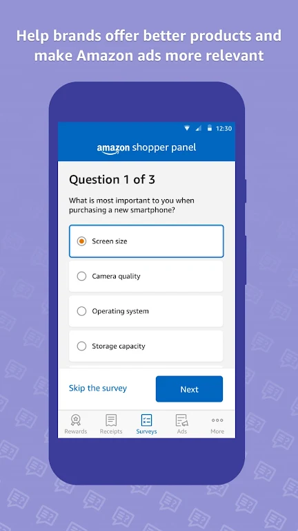 Participation is voluntary, and you can opt out at any time. Amazon only receives information you choose to share, such as receipt details, survey answers, or ads you've interacted with. Please note that the app uses a VPN connection to collect ad data, but this feature is optional and can be disabled whenever you prefer.