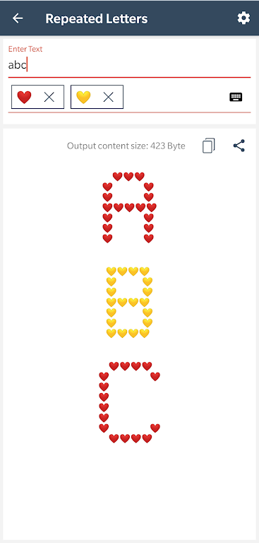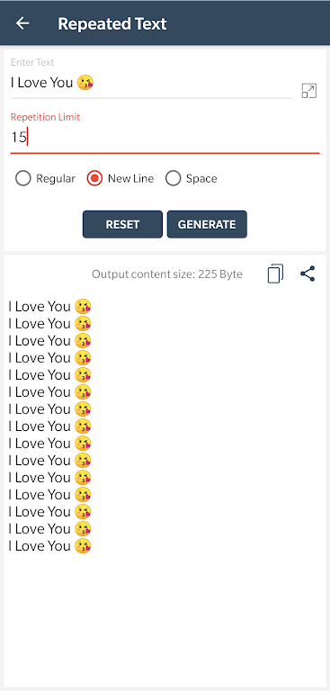 This app is designed to be user-friendly and efficient, offering an easy-to-use interface with material design. You can generate repeated text, emoji characters, or even random ASCII characters quickly, making it ideal for both casual use and more creative purposes. It's the best "message repeater" and "emoji generator" app for creating unique content that stands out online!