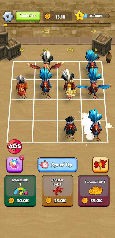 Merge similar rooster fighters to create more powerful contenders and progress faster in tournaments. Even when you're not playing, your rooster fighters will continue to generate passive income, allowing you to return to an abundance of rewards. Maximize your earnings, enhance your fighters, and accelerate your journey to the championship.