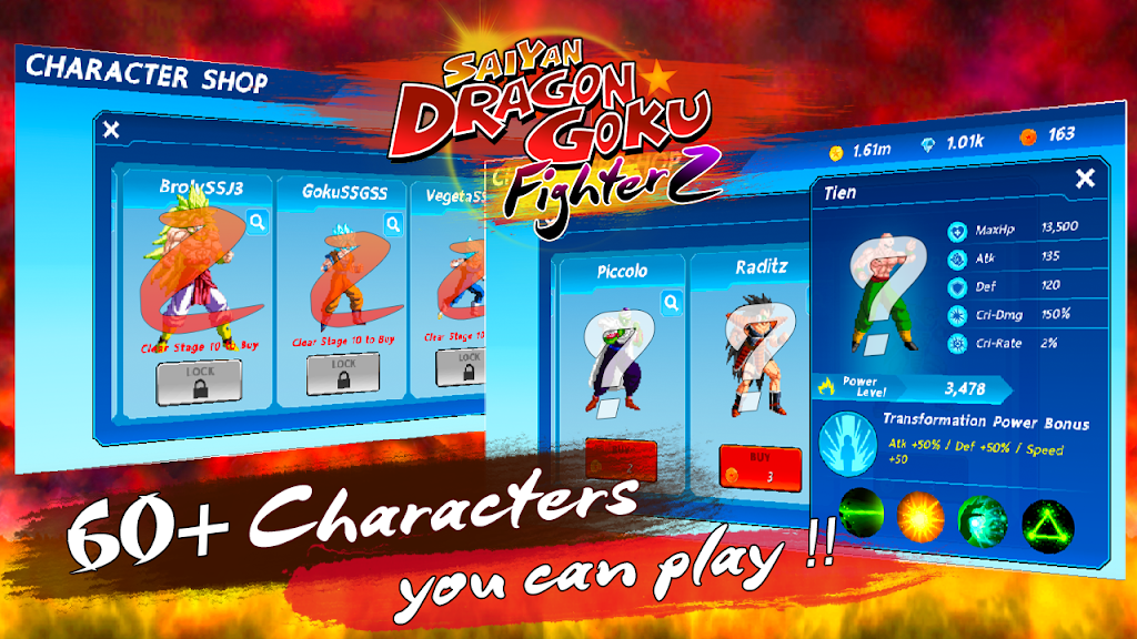 Join Goku and his friends in this action-packed fighting game inspired by Dragon Fighter. Battle against powerful enemies from a parallel world in an epic showdown to protect the special ball! With over 60+ playable characters and 100+ signature skills, this game brings the ultimate Dragon Fighter experience to life. Transform, upgrade, and unleash super skills in thrilling battles across seven intense story chapters.