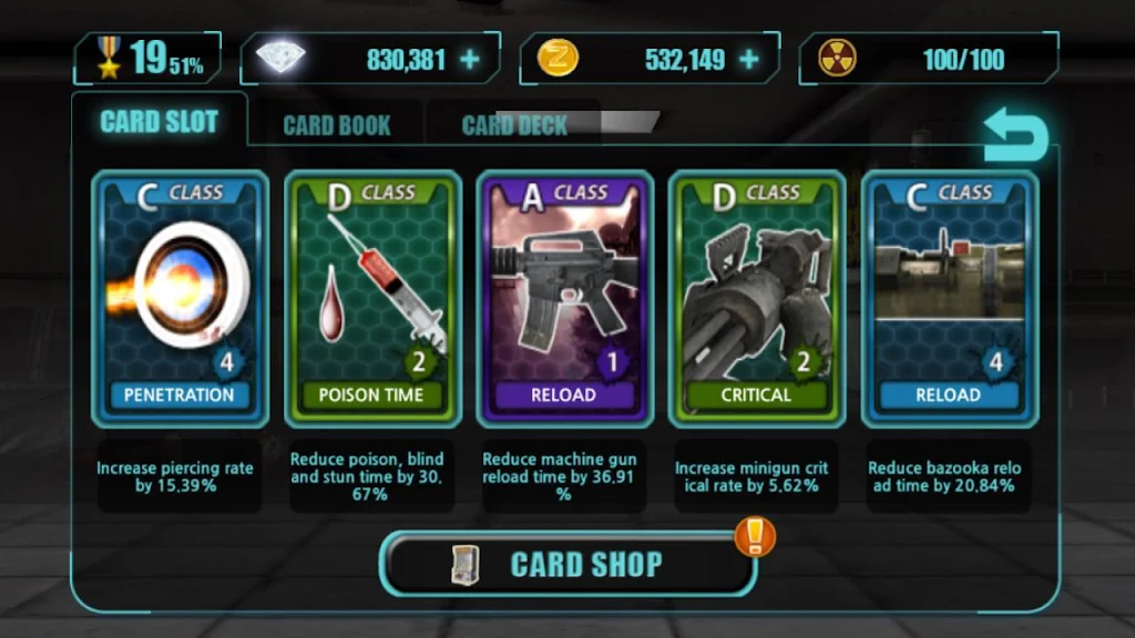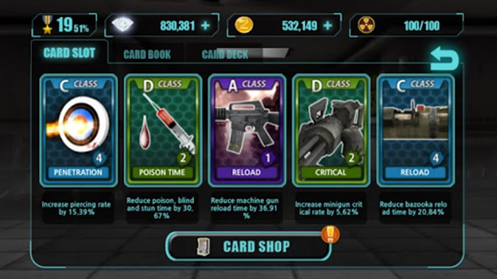Earn game money by clearing event stages, power up with special ability cards, and test your skills in a competitive PVP zombie shooting game against players worldwide. Enjoy rapid loading, small capacity, and smooth performance anytime, anywhere.