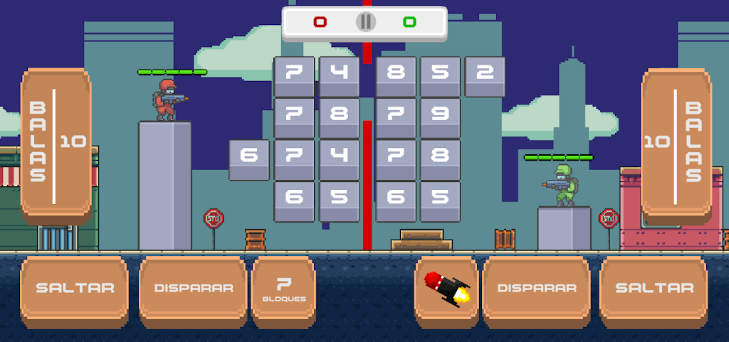 Experience an exciting and fast-paced game where you can either challenge a friend on the same phone or dive into solo play. In this dynamic game, two soldiers battle it out on shifting platforms, testing your reflexes and strategy. As the platforms move up and down, you'll need quick thinking and precision to outshoot your opponent. Gather 7 blocks to unleash powerful missiles and take your combat skills to the next level!