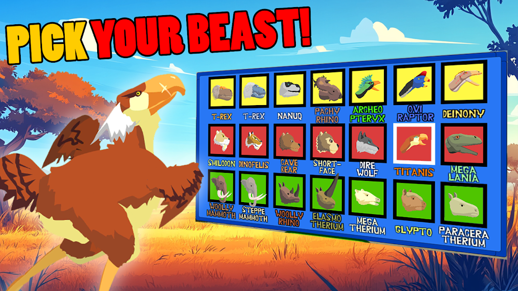 Engage in intense battles with powerful predators like the Saber-toothed Tiger, Terror Bird, and Short-faced Bear, as well as mighty herbivores such as the Woolly Mammoth and Woolly Rhino. Fight for your place at the top of the food chain in diverse environments, including snowy landscapes, jungles, and savannas. Who will emerge as the ultimate prehistoric king?