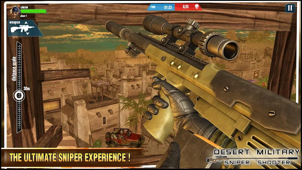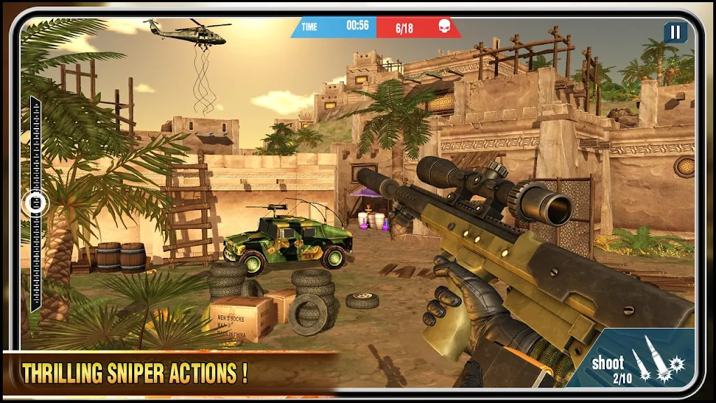 • Epic sniper strike force gameplay across desert war zones, WW2 scenarios, and hostile rescue missions.