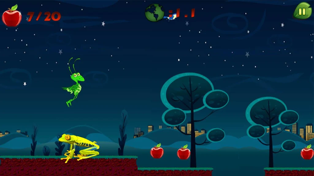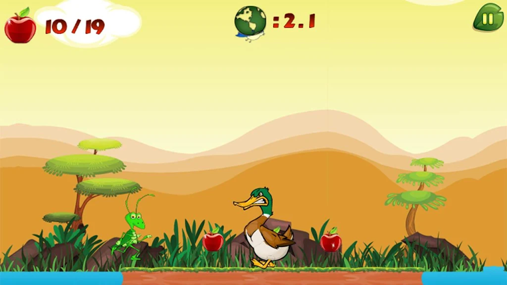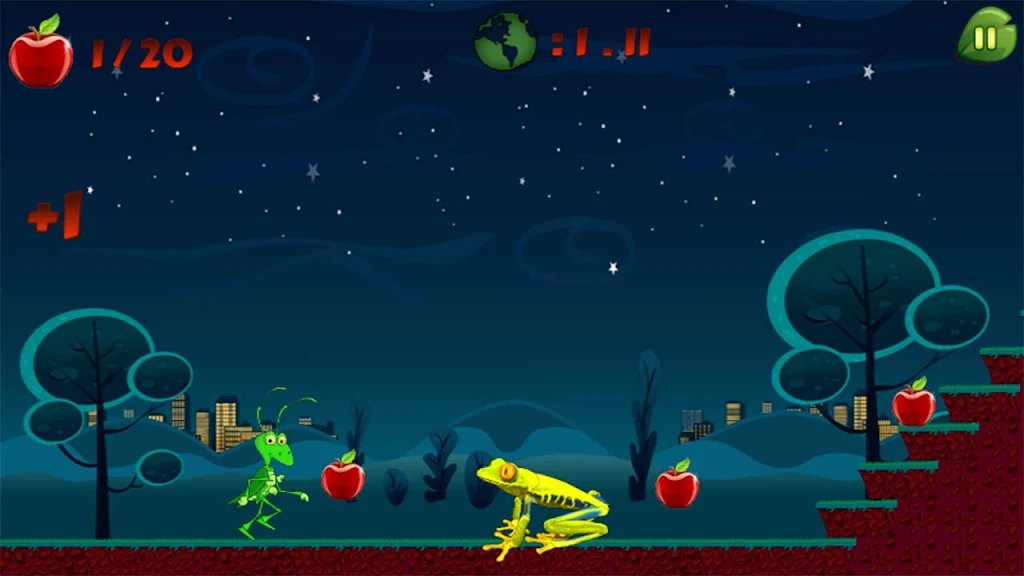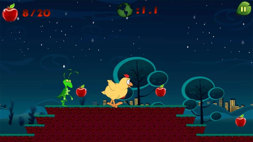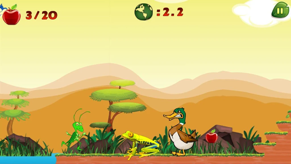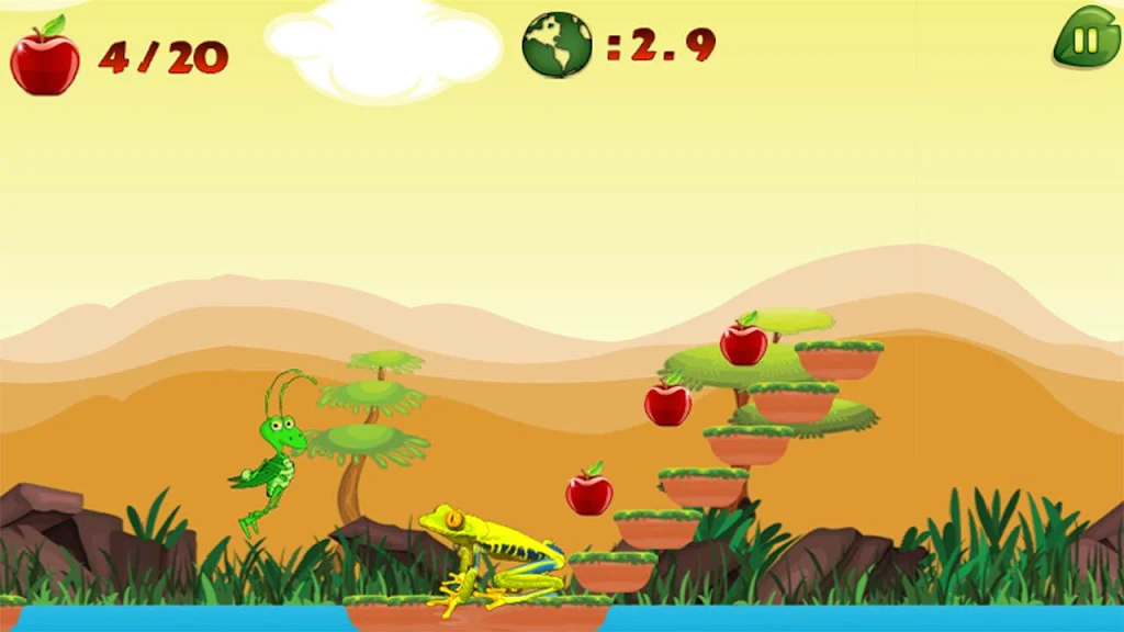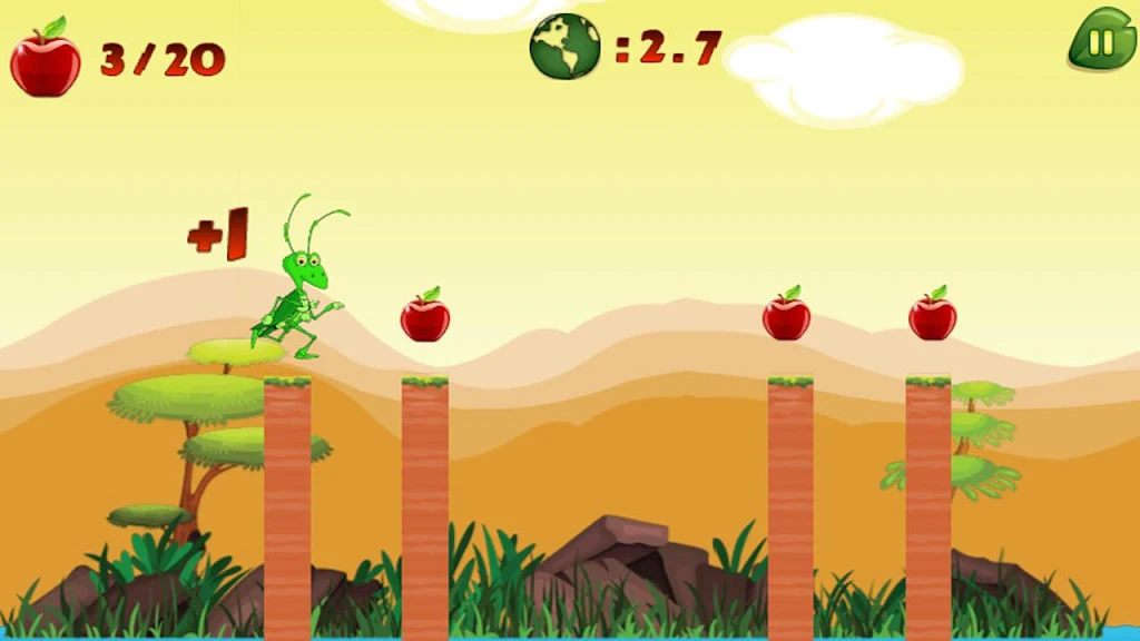 Control the grasshopper by tapping the screen to make him jump and avoid the hungry frogs, ducks, and hens in his way. Collect as many apples as you can without being caught, and complete each level to help our grasshopper reach his lady! With two unique worlds, each filled with 12 challenging levels, this game offers endless fun and excitement for players of all skill levels. Relax with its catchy music and sound effects as you navigate through each adventure. Perfect for anyone looking for a fun run game to pass the time!