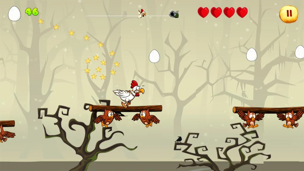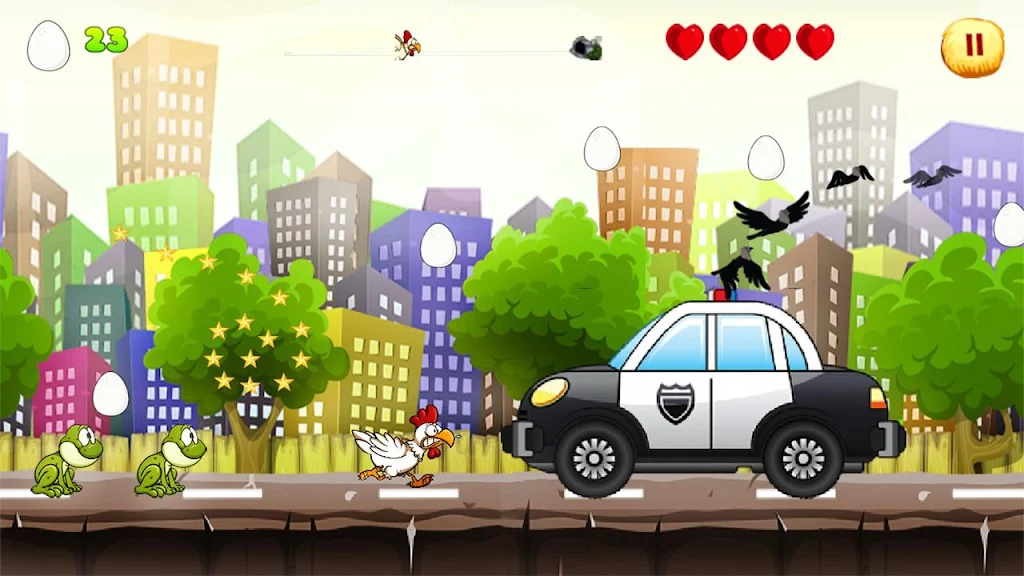 The adventure begins when our happy chicken is sold to a butcher, only to make a daring escape on the way to the city. Now, the chicken must journey through challenging landscapes—including a farm, a city, a Halloween world, and a jungle—while avoiding obstacles and enemies. Collect eggs along the way to maintain energy and defeat over 80 unique enemies that block the path. Can you help the chicken make it home safely?