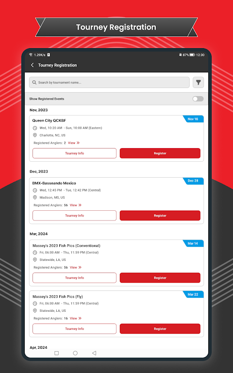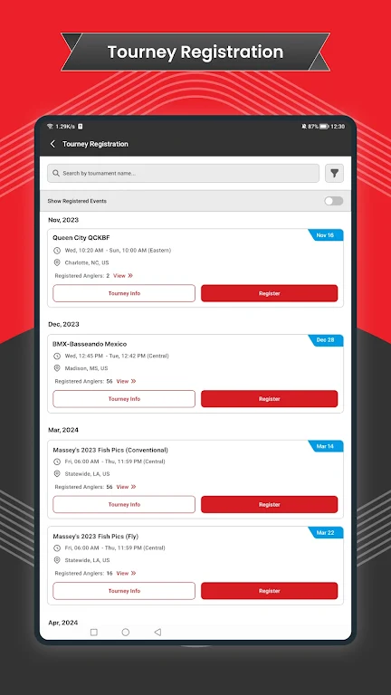TourneyX® Pro delivers a streamlined, mobile-first way to run and compete in fishing events—bringing fast scoring, easy submissions, and reliable tools trusted by tournament directors nationwide. Designed by anglers, it simplifies every step of online and live events while supporting real-time leaderboard fishing and kayak bass fishing tournaments online.