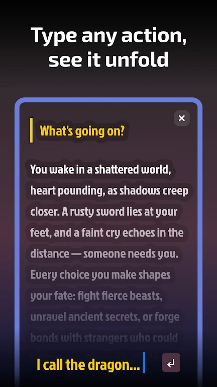 - **Total Creative Control** – Type any action, dialogue, or idea and watch the AI story generator build a dynamic text RPG that evolves with your choices in real time, offering limitless AI fantasy adventures.