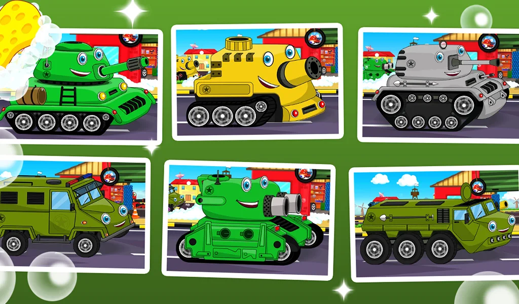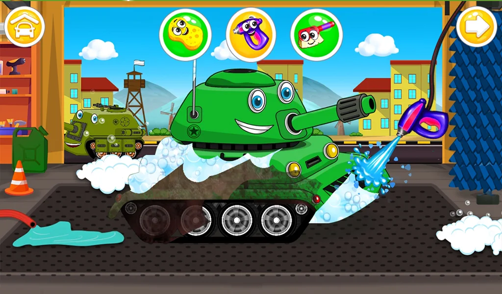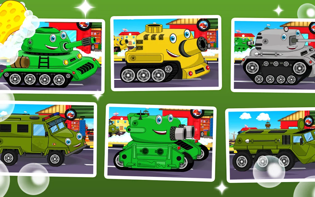 Army vehicles tackle tough missions and often return broken, dusty, and muddy—your carwash and garage are here to help! Wash, clean, and repair a huge variety of transport, from tanks and jeeps to anti-aircraft machines. Perfect for parents searching for *interactive car wash games for kids*, *toddler vehicle cleaning games*, or *educational mechanic games for children*.