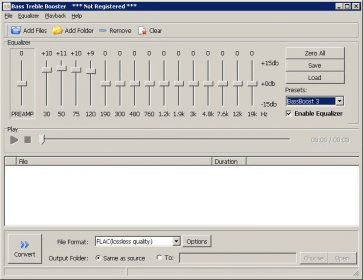 Create a playlist by browsing your drives or dragging files into the app. Bass Treble Booster supports popular audio formats and lets you fine-tune the EQ manually or apply ready-made presets. Adjust overall volume, preview changes in real time, and lock in the perfect tone. Unlike standard audio players, you can export your custom EQ as a brand-new file—ideal for permanent equalization, audio mastering, or preparing tracks for any device. You can even convert between formats like FLAC, WAV, or MP3 with flexible output folder options.