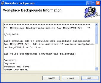 Workplace Backgrounds (explorer.exe). This add-on provides six workplace backgrounds for MorphVOX Pro.