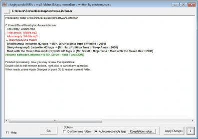 Taghycardia scans your entire MP3 archive, automatically correcting ID3v1/2 tags when files lack artist, album, or title information. It also ensures uniformity across folders by fixing discrepancies in artist/album metadata. Whether you need a fast fix or want to customize the process, taghycardia offers flexible solutions to suit your needs. It can even rename MP3 folders with a fixed format like Artist - Album (Year) for easy navigation.