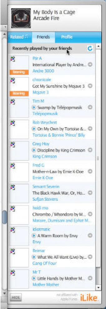 Stay connected with the latest music, concert updates, and videos from your favorite artists! iLike Sidebar for iTunes and Windows Media Player lets you explore new music and discover fresh artists that match your tastes. Easily share your music library, get updates on new releases, and enjoy a personalized music experience with iLike.
