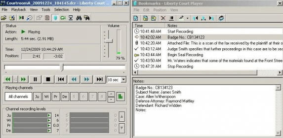 Liberty Player offers seamless playback for audio and video files recorded in Liberty Court Recorder, complete with advanced media management features such as bookmarking, note-taking, and multi-track mixing.