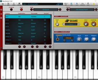 The interface is straightforward yet powerful. The upper panel is divided into two graphic channels that add effects to the notes played on the keyboard. This layout makes it easy to compose melodies and rhythms, and to record them for playback and editing. NanoStudio also offers several backing tracks to inspire your compositions. While the program includes a range of customizable tools, users can easily access the equalizer, effect consoles, and additional instruments via the top buttons, enhancing the creative process.