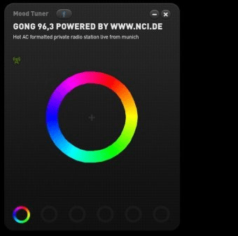 The interface centers on a vibrant circular wheel filled with colors, each tied to a different mood. Hovering reveals expressive tooltips like “hopeful,” “angry,” “happy,” or “witty.” Just drag toward the emotion you want, and the tuner adjusts the color and automatically switches stations. Once you learn the smooth gesture control, it becomes a fun, seamless way to explore feelings through sound—perfect for users who love interactive music apps or immersive interfaces similar to open-world anime gacha UIs.