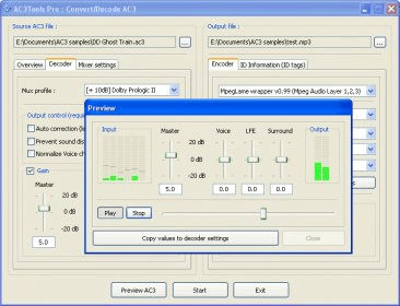 The AC3 Decoder converts multi-channel AC3 audio into two-channel MP3, WMA, WAV, or Ogg Vorbis files. Its advanced algorithm splits audio channels to preserve a realistic surround-sound effect, replicating the feel of listening to the original AC3 file on a 5.1 audio system—according to Dolby Laboratories.