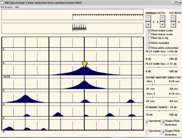 Spectratune (RealTimeSpectro.exe). Dual Analysis Modes: Simple Displayed Arrow (Showing Fundamental Like a Chromatic Tuner) for Single-Pitch Sources.