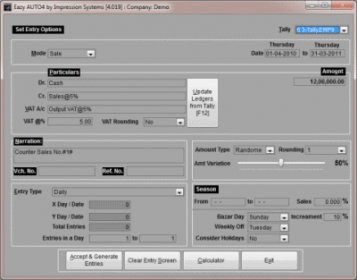 EazyAUTO4 (AUTO4.exe). Eazy AUTO4 is an automatic entries generator for Tally. Features: Fully integrated with Tally 6.3 to Tally.ERP 9...