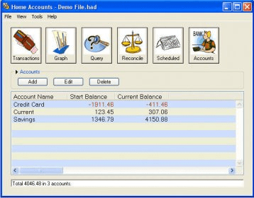 Home Accounts (ezhomeacts.exe). Set up as many accounts as you wish and enter individual transactions to keep track of your spending and balances.