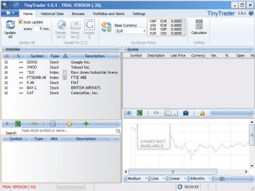 TINYTRADER is a versatile trading software that seamlessly downloads stock quotes from Yahoo! and allows you to manage multiple portfolios. Whether you're trading stocks, bonds, mutual funds, ETFs, or tracking currency exchange rates, TINYTRADER provides an all-in-one solution for managing your investments. The software supports automatic currency conversion and integrates data from global finance websites, ensuring you have the most up-to-date information at your fingertips.