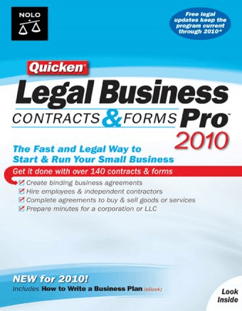 Completely updated for 2010, this software package ensures that you have access to the most current legal documents and forms. With over 140 customizable contracts, forms, and worksheets, Quicken Legal Business Pro provides everything you need to run your business efficiently. The step-by-step checklists and free downloadable updates throughout the year make it easy to stay on top of any changes in the law, giving you peace of mind as you focus on growing your business.
