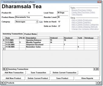 Clearly marked buttons in the main window let you process transactions, update units on hand, manage lead times, and fine-tune product details at any time. Whether you're optimizing workflows, scaling operations, or ensuring consistent supply levels, this software delivers reliable and flexible inventory management for any business.