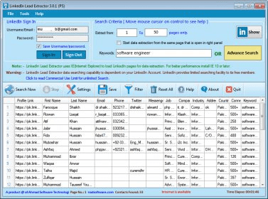 - Extract LinkedIn names, emails, phone numbers, addresses, company details, job titles, Twitter links, countries, profile URLs, and Messenger IDs. - Search and capture targeted customer data using custom keywords for precise lead filtering. - Supports full Unicode character sets and saves results in Unicode formats. - Automatically pauses/resumes extraction during internet failures and recovers results with one click after shutdowns. - Export email addresses and lead data to EXCEL, CSV, or tab-delimited TXT files, with automatic tracking of previously extracted profiles.