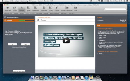With WISO Steuer: 2013, you can easily complete your income tax return for 2012 on your Mac—whether you're an employee, freelancer, landlord, or retiree. The software even supports joint tax filings for registered partners. No more complicated forms or expensive consultations—WISO Steuer makes tax filing simple and efficient, saving you both time and money. Learn all about tax-saving opportunities legally, with clear and easy-to-follow video explanations for complex issues.