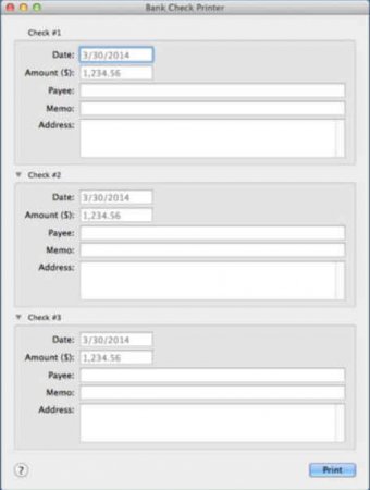 Bank Check Printer is a simple-to-use Mac application that allows you to quickly print bank checks. This tool is designed to work with standard, three-to-a-page, business-sized checks. If your checks are already pre-printed with your routing number and account information, you can start printing with just a few steps. Simply enter the date, amount, and recipient name, then hit the print button. You can even add a note in the memo section or include an address for a personalized touch.