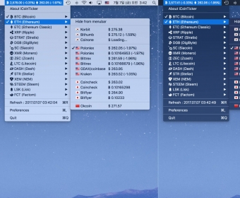 iCoinTicker is a lightweight menu bar ticker that delivers the latest cryptocurrency prices (BTC, ETH, ETC, XRP, and more) from Poloniex and Bittrex. Designed for clarity and speed, it auto-refreshes at intervals from 10 seconds to 1 hour, keeping your data accurate at all times.