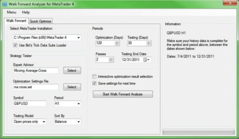 Walk Forward Analyzer (analyzer.exe). The Walk Forward Analyzer uses MetaTrader's own Strategy Tester to perform a walk forward analysis...