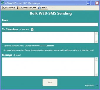 2-WaySMS Messenger lets you send SMS messages directly from your PC using your own custom Sender ID. Manage contacts effortlessly with a built-in address book and organized group lists, ideal for personal, business, and bulk messaging needs.