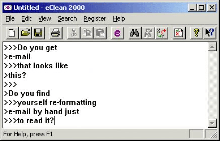 eClean 2000 (formerly E-Clean) is an enhanced text editor designed to replace Notepad, offering users a streamlined way to manage and clean email content. Its standout feature is the ability to automatically remove unwanted formatting marks, such as the ">" symbols from forwarded/replied messages, along with eliminating unnecessary line breaks in emails. This makes eClean 2000 the ideal tool for anyone who frequently deals with email content, ensuring only legible text remains. Besides this, it supports all standard text-editing functions like Open, Save, Undo, Search/Replace, and Print, offering the best of both worlds for text management.