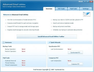 Synchronize PST files manually or on a scheduled interval, manage conversations chronologically, remove duplicates efficiently, and protect your mailbox from junk mail—all while enjoying smooth compatibility with MS Windows 2000/2003/XP/Vista and MS Office 2007. Ideal for users seeking advanced Outlook tools, enterprise mailbox management, or reliable email archiving.
