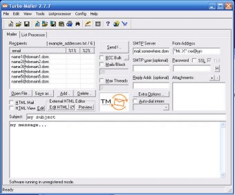 Designed for simplicity yet offering powerful options, Turbo-Mailer is perfect for sending newsletters, promotional emails, or personalized circulars. With an easy-to-use interface and advanced email list processing capabilities, including support for formulas, Turbo-Mailer makes mass emailing a breeze. Parallel multi-threaded SMTP ensures the highest possible transfer speed, enabling smooth, large-scale email campaigns.