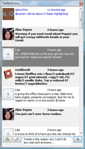 Twitterlicious (Twitterlicious.exe). Twitterlicious is a Windows application that makes using Twitter more fun.