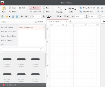 Design effective surveillance systems by integrating various Hikvision products. Use an intuitive interface to search for and select network cameras, speed domes, DVRs, NVRs, and switches for your diagrams. Tailor every aspect of your security setup with ease using the available product shapes and tools.