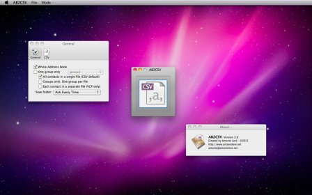 AB2CSV is a fast and efficient Mac OS X utility designed to help you export your Address Book contacts into CSV or VCF files. With just a click, you can scan your system and extract all relevant contact information, making it simple to share or modify. This tool is perfect for users who need a quick and reliable way to back up or transfer their contact data.