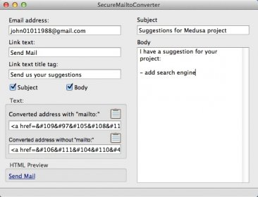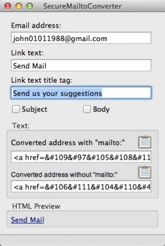 With a simple interface, SecureMailtoConverter allows you to input your email address, link, title tag, and optional subject and body fields. Once you enter the necessary information, the app lets you preview the encoded address before generating the HTML code. This way, you can easily protect your email address from potential spam and unwanted solicitations.