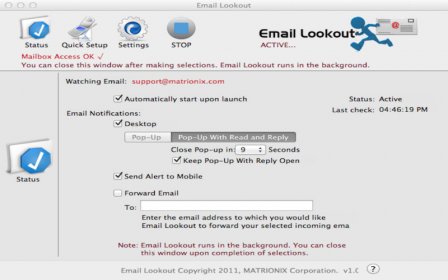 Email Lookout works with any email address and all Mac OS versions, including OSX Lion. Whether you want instant desktop notifications, mobile phone alerts, or automatic forwarding of urgent emails, Email Lookout keeps you informed at all times. Perfect for power users who need dependable multi-device email monitoring and uninterrupted communication.